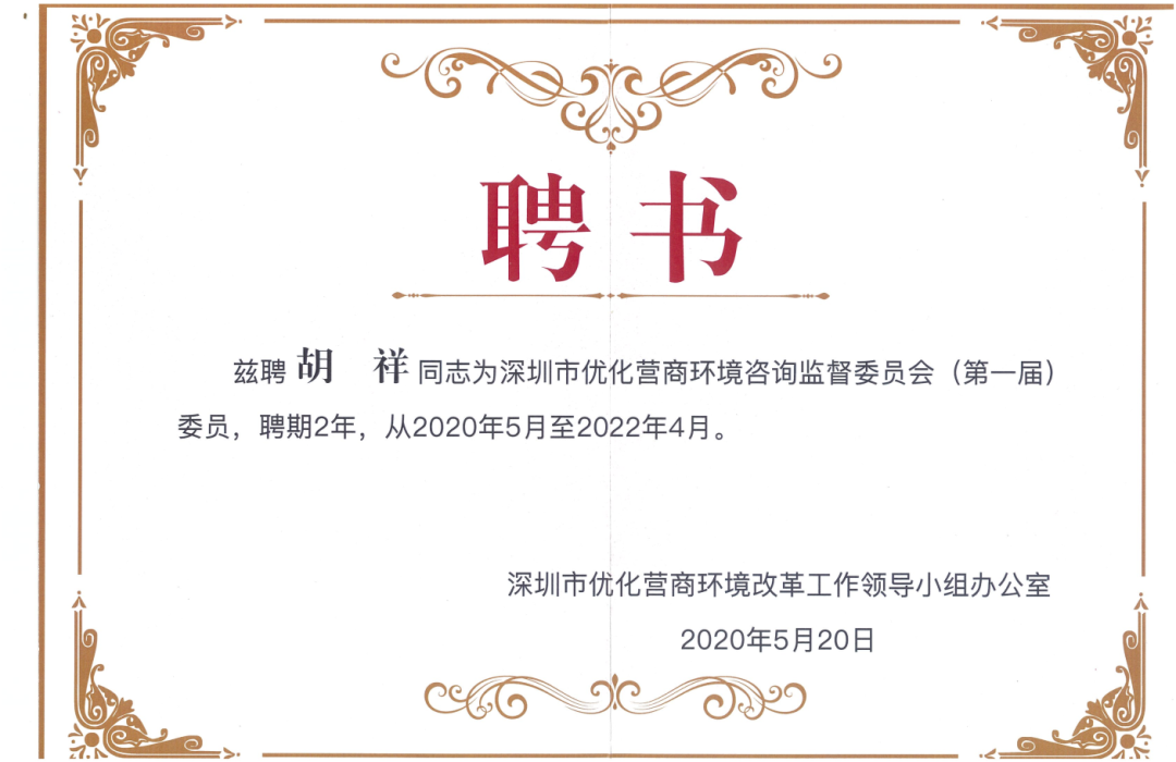 北科生物胡雋源博士受聘 “ 深圳市優(yōu)化營(yíng)商環(huán)境咨詢監(jiān)督委員會(huì) ” 副主任委員