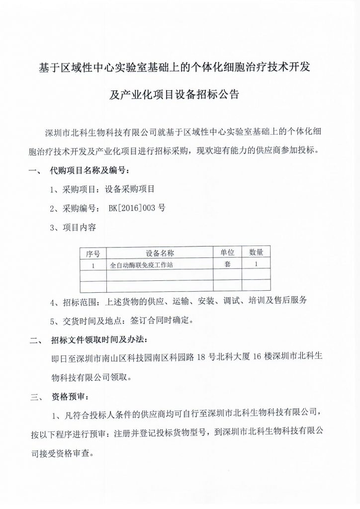 基于區(qū)域性中心實驗室基礎(chǔ)上的個體化細胞治療技術(shù)開發(fā)及產(chǎn)業(yè)化項目設(shè)備招標公告