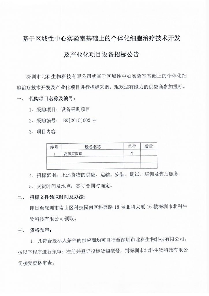 基于區(qū)域性中心實驗室基礎上的個體化細胞治療技術(shù)開發(fā)及產(chǎn)業(yè)化項目設備招標公告