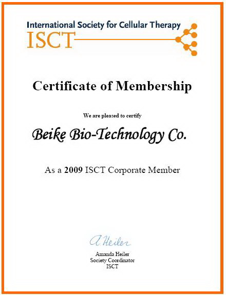 20098月,北科生物獲得國(guó)際細(xì)胞治療協(xié)會(huì)(International Society for Cellular Therapy,ISCT)會(huì)員資格,并獲得了該協(xié)會(huì)頒發(fā)的會(huì)員證書(shū),成為該機(jī)構(gòu)的正式會(huì)員。