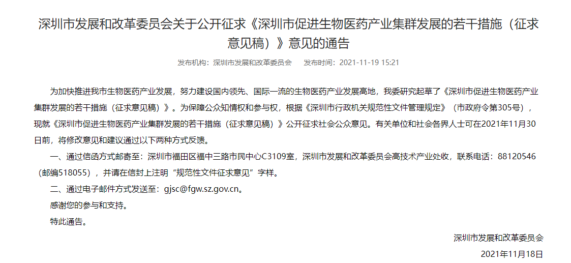 近日,為落實《中共中央 國務(wù)院關(guān)于支持深圳建設(shè)中國特色社會主義先行示范區(qū)的意見》《深圳市關(guān)于進(jìn)一步加快發(fā)展戰(zhàn)略性新興產(chǎn)業(yè)的實施方案》(深府〔2018〕84號)等政策精神,充分銜接《深圳市促進(jìn)生物醫(yī)藥產(chǎn)業(yè)集聚發(fā)展指導(dǎo)意見》及相關(guān)配套文件(深府辦〔2020〕2號),加快推進(jìn)我市生物醫(yī)藥產(chǎn)業(yè)發(fā)展,努力建設(shè)國內(nèi)領(lǐng)先、國際一流的生物醫(yī)藥產(chǎn)業(yè)發(fā)展高地,深圳市發(fā)改委研究起草了《深圳市促進(jìn)生物醫(yī)藥產(chǎn)業(yè)集群發(fā)展的若干措施(征求意見稿)》。