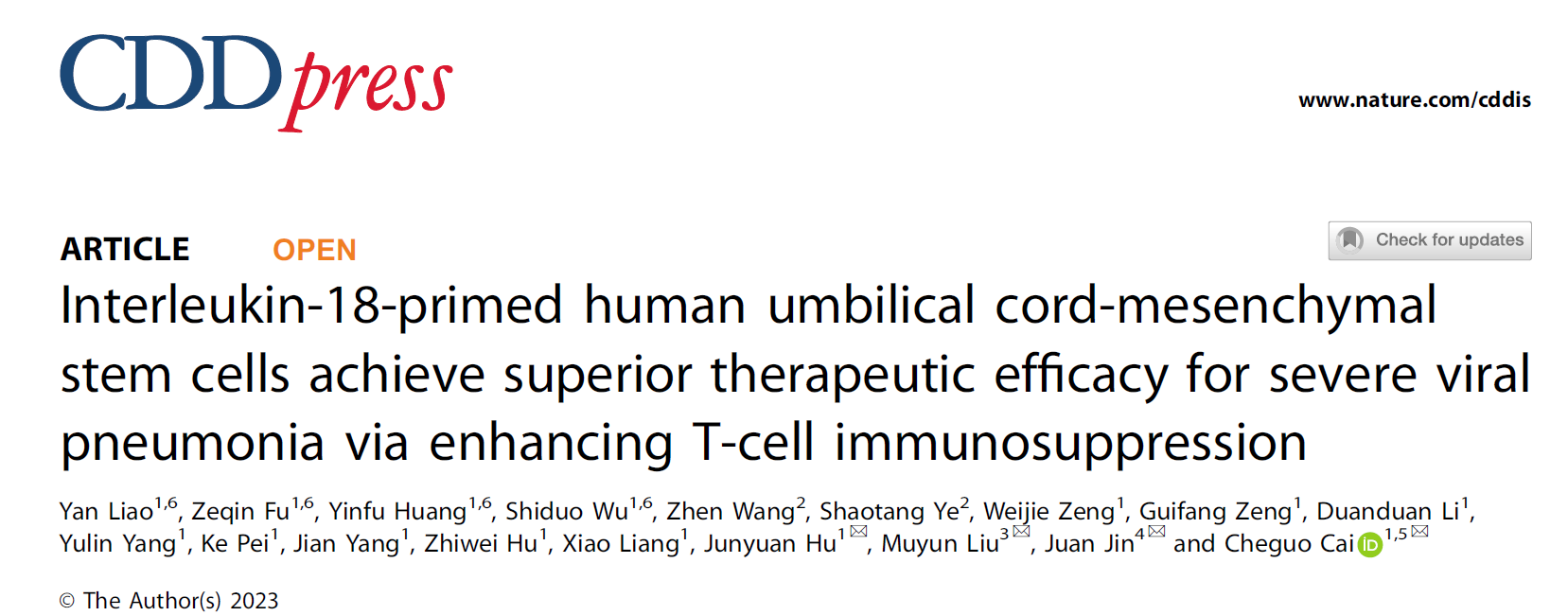 2023年1月28日,深圳市北科生物科技有限公司研發(fā)中心蔡車國(guó)教授和廖延博士團(tuán)隊(duì)在國(guó)際權(quán)威學(xué)術(shù)期刊《Cell Death & Disease》(影響因子=9.68,中科院一區(qū))在線發(fā)表關(guān)于炎癥因子IL-18賦能型臍帶間充質(zhì)干細(xì)胞可增強(qiáng)針對(duì)重癥病毒性肺炎導(dǎo)致肺損傷治療效果的研究成果。論文題為:“Interleukin-18-primed human umbilical cord-mesenchymal stem cells achieve superior therapeutic efficacy for severe viral pneumonia via enhancing T-cell immunosuppression”。近年來(lái)。北科生物科研成果轉(zhuǎn)化穩(wěn)步提升,不僅體現(xiàn)在“量的增長(zhǎng)”上,更體現(xiàn)在“質(zhì)的飛躍”上。北科生物在高水平論文,尤其是國(guó)際權(quán)威期刊的學(xué)術(shù)論文發(fā)表方面不斷取得突破, 正是其科研實(shí)力和技術(shù)創(chuàng)新方面的實(shí)力體現(xiàn)。