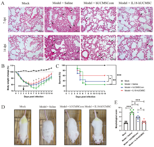 在本研究中,研究人員發(fā)現(xiàn)通過(guò)使用炎癥因子IL-18在體外培養(yǎng)階段“賦能”臍帶MSCs,可以在體外實(shí)驗(yàn)中有效增強(qiáng)對(duì)T細(xì)胞的免疫調(diào)節(jié)作用;在體內(nèi)實(shí)驗(yàn)中緩解病毒引起的肺部重癥炎癥,從而減少肺部損傷、提高病毒性肺炎模型小鼠的生存率,且改善多種臨床表現(xiàn)(圖2)。